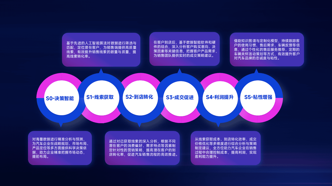 通过拓宽潜在客户来源、、优化线索分配并提高到店转化率,,以增强销售效率。。同时,,,,利用线索数据不断优化分析模型,,,有效提升转化率,,,,扩大营销影响力。。。