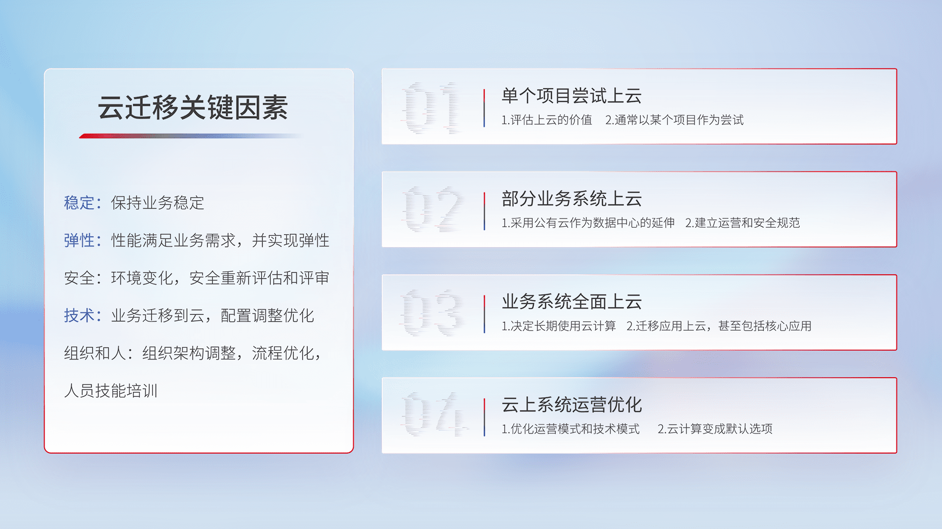 结合实际业务,,从规划设计、、、云平台选型、、、云原生改造、、、数据迁移、、集成交付,,,,迁移全过程为客户识别最佳上云路径,,,做好风险识别管理,,,,设计网络架构、、、、身份权限、、、、安全审计合规、、、、操作审计、、、、日志审计、、监控告警策略、、、、多站点容灾设计等,,,,对云上基础设施进行整体规划,,,提升IT治理水平,,以满足弹性、、、高可用、、、、高性能的需求。。。
