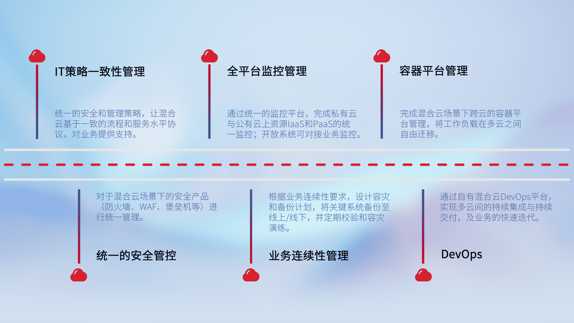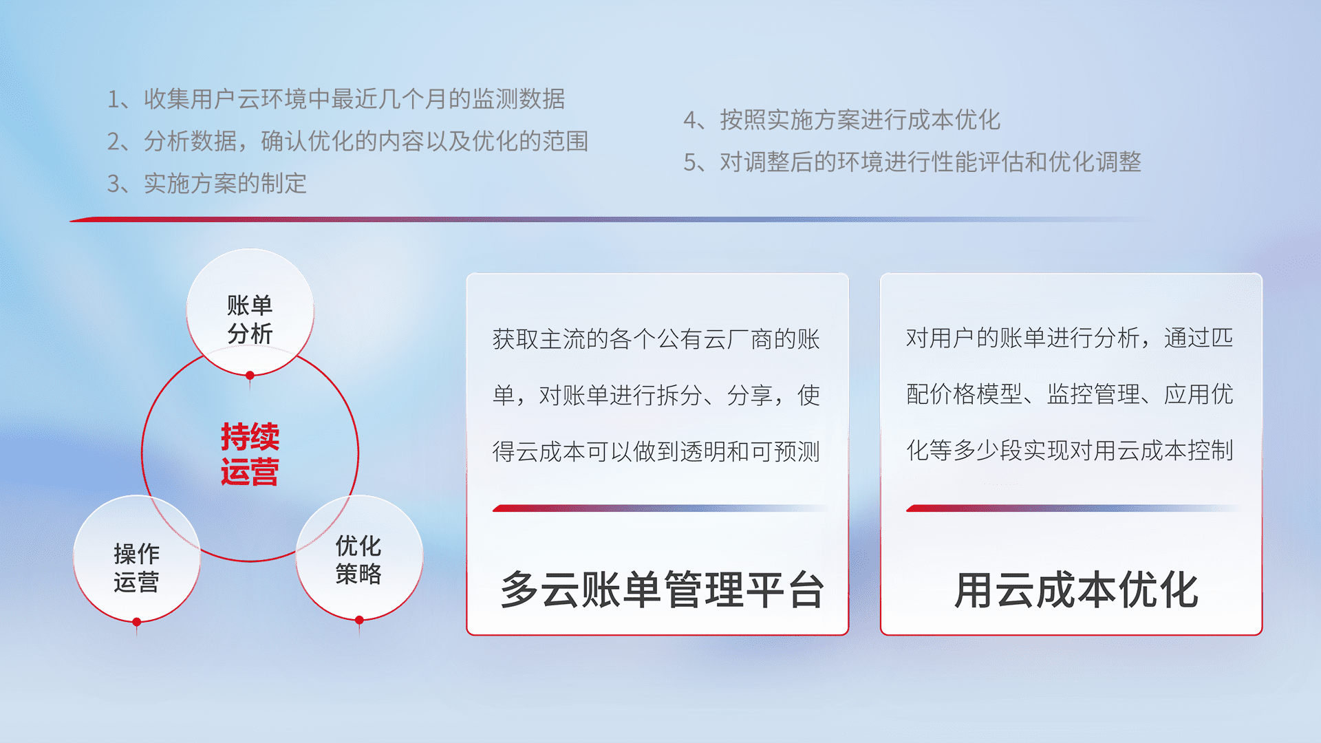 通过多云纳管,,以统一的资源数据模型把客户的云资源进行抽象和封装,,,进而实现对多云资源的统一操作,,保障云资源管理的可靠性、、稳定性与可用性。。。。量身定制化运维内容,,配置、、开发运维、、补丁管理、、、备份、、、监控、、、认证和访问管理、、、、审计和日常巡检等,,,保障在用云过程中的可靠度,,,稳定度以及高可用率。。
