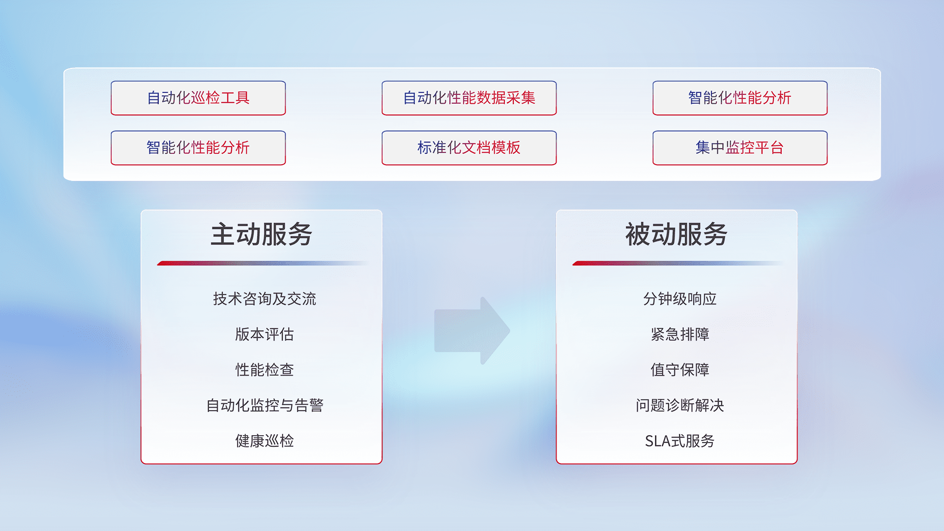 智能化工具和标准化文档,,,保障服务质量,,,提供主动服务(包含技术咨询、、版本评估、、、性能检查、、、自动化监控与告警、、、健康巡检)和被动服务包含(分钟级响应、、、、紧急排障、、值守保障、、、问题诊断解决、、、SLA服务)。。。。